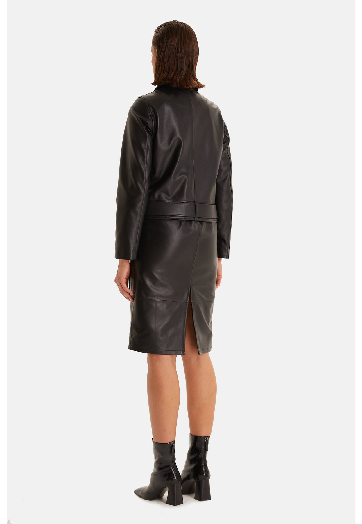 Crafted from genuine leather, jacket achieves an elegant look throughout the body. Make a difference with a modern design with the belt of the jacket.