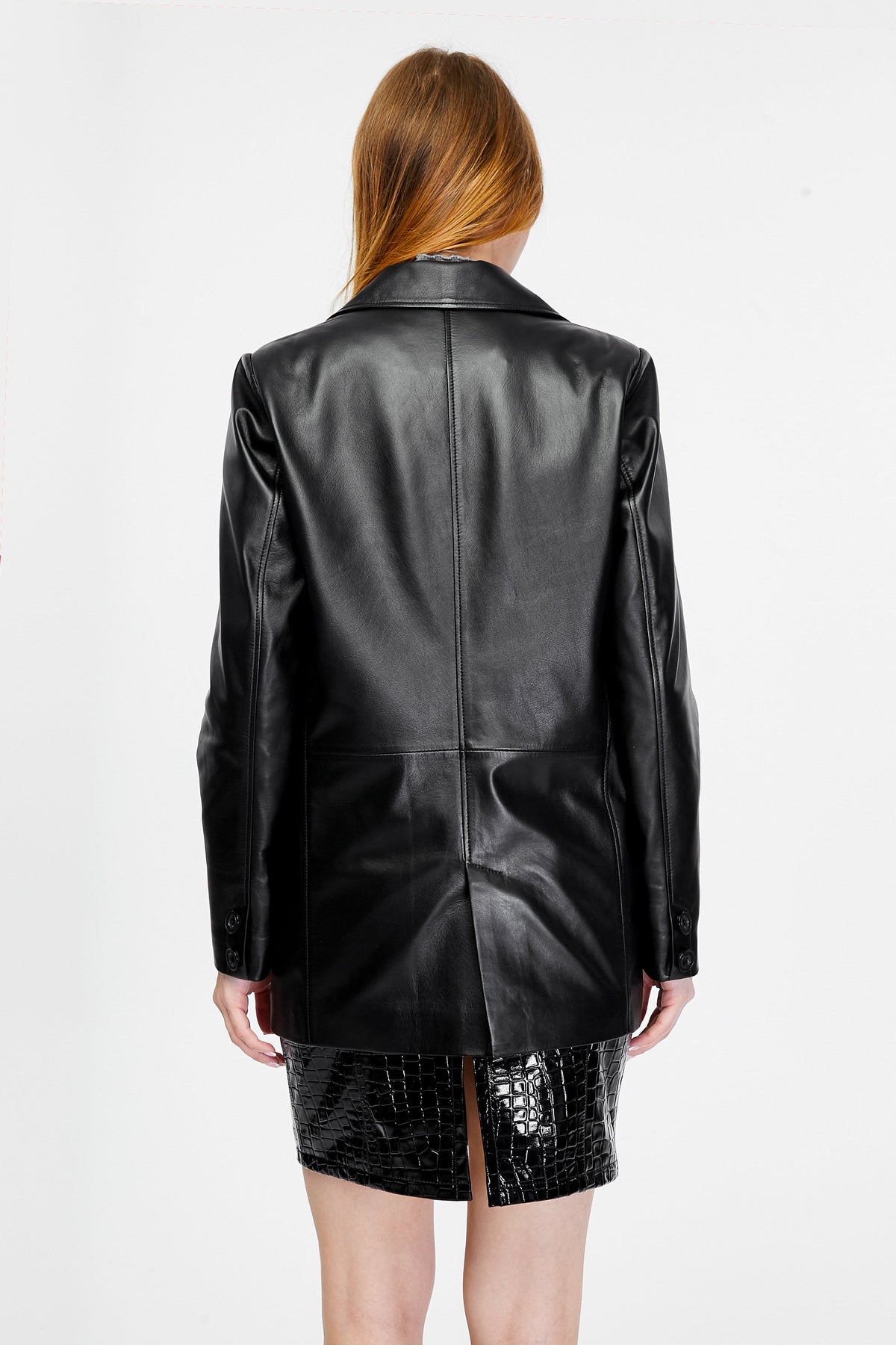 Female model wearing black leather jacket (back)