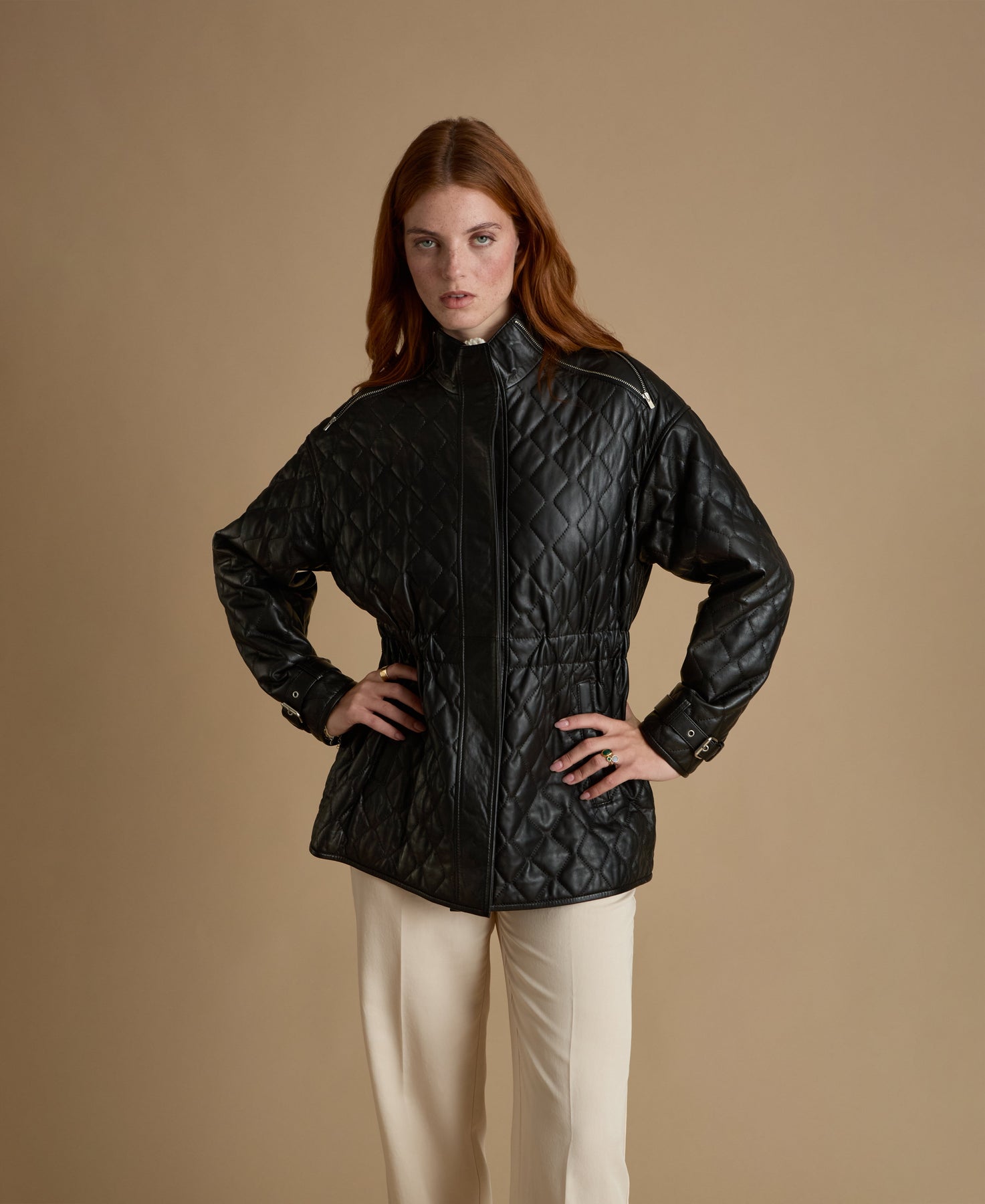 You can get a simple and stylish look with a double-breasted blazer with a double-breasted design, with a zip fastening on the shoulder, a belt strap on the sleeves, and a masterfully crafted genuine leather blazer.