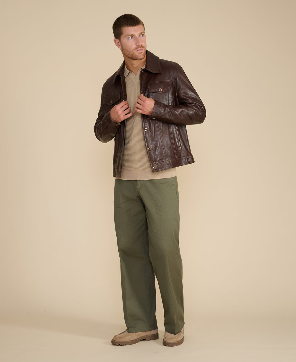 A refined take on the classic trucker jacket, the Oliver Leather Jacket is handcrafted from premium British leather, this is the ultimate blend of rugged style and polished sophistication, making it a versatile addition to any manβs wardrobe.