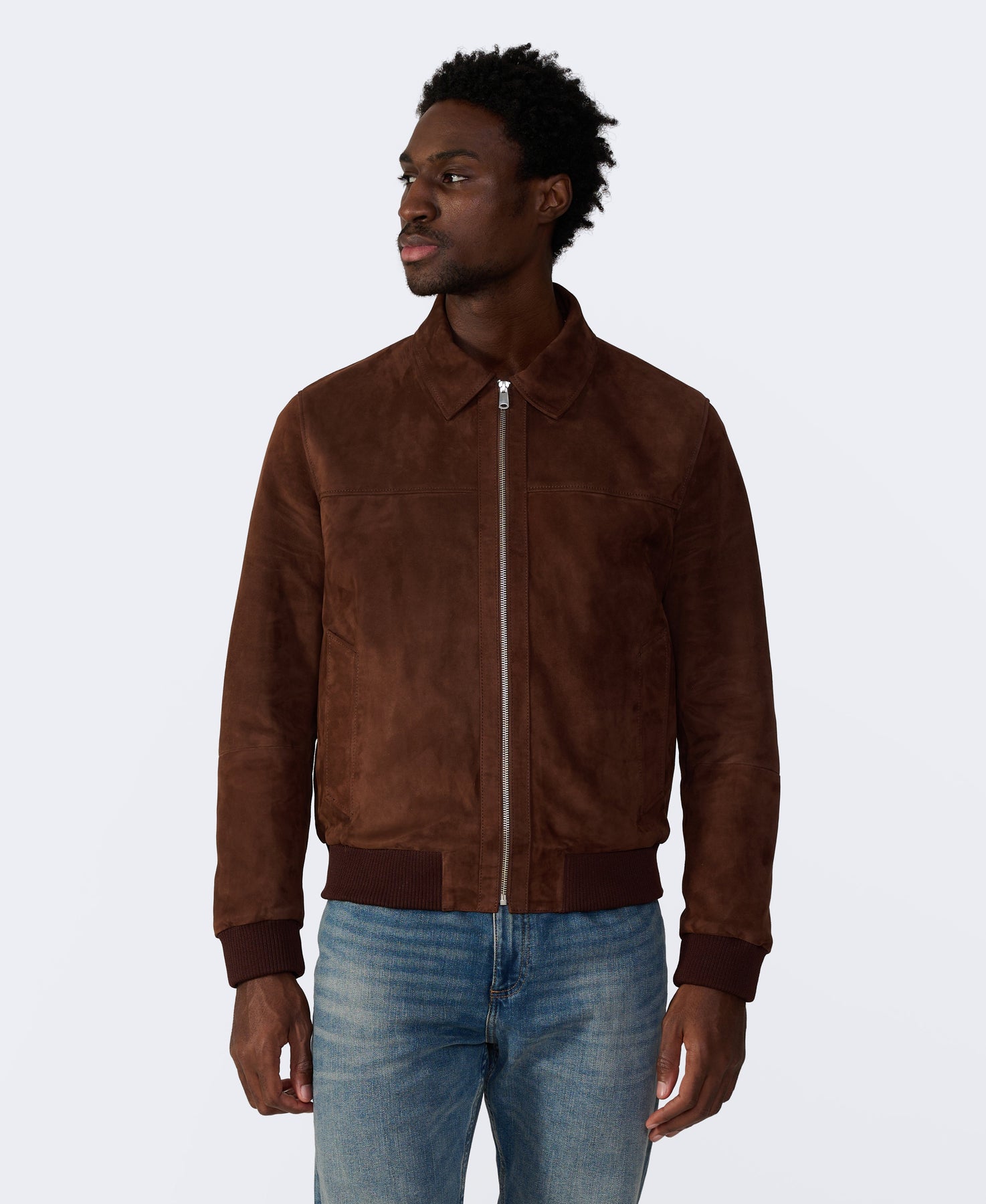 Designed for crisp spring mornings and cool evenings, this suede bomber jacket blends classic craftsmanship with a fresh, easy going feel. The deep brown suede is rich in tone and texture, while the ribbed hem and cuffs add that essential bomber edge.