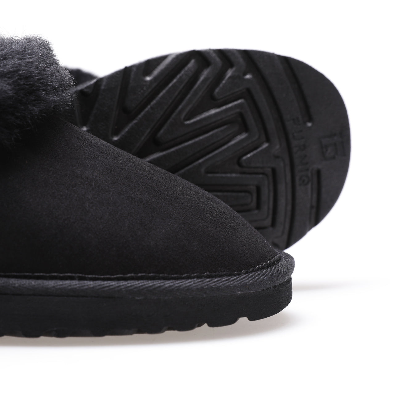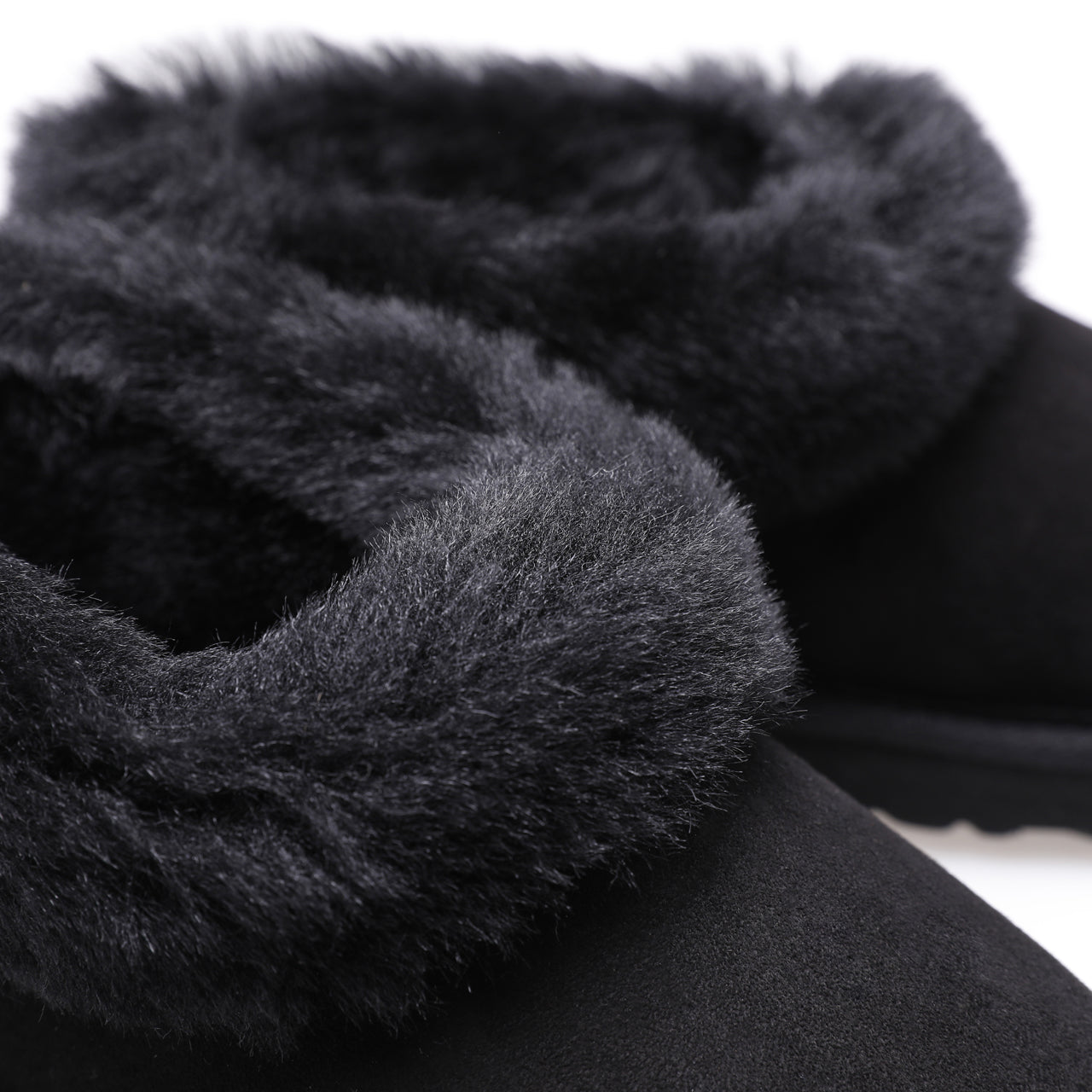 Black suede sheepskin slipper close-up