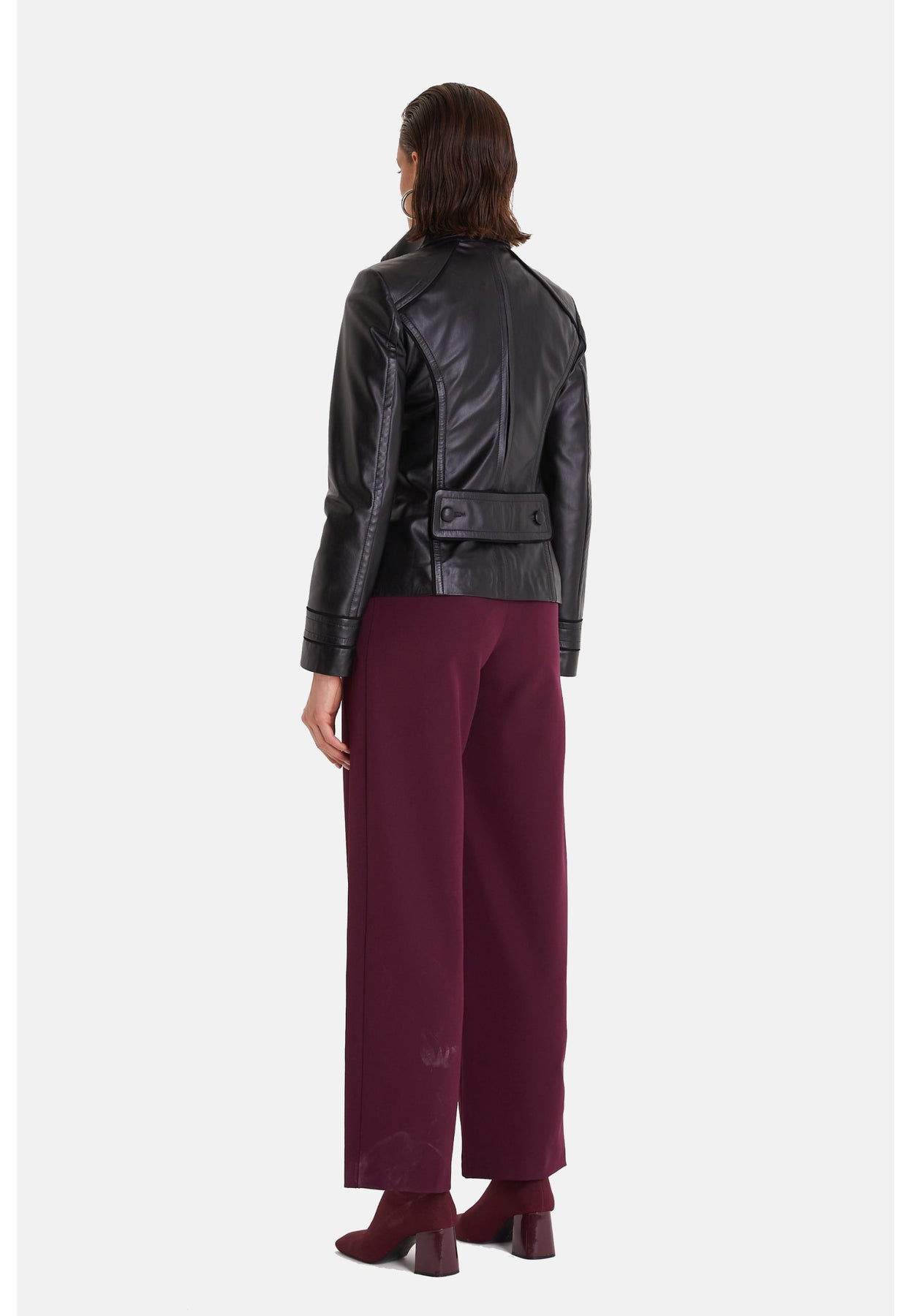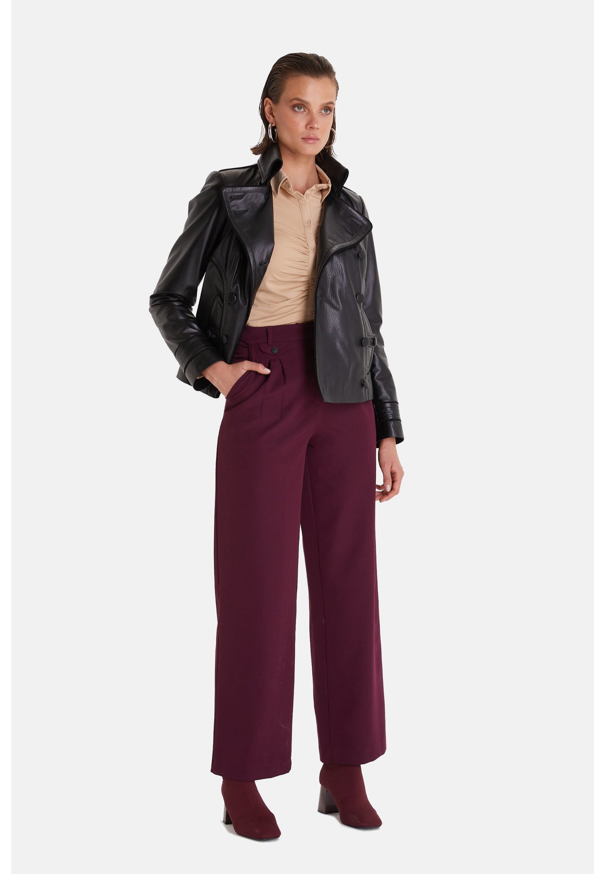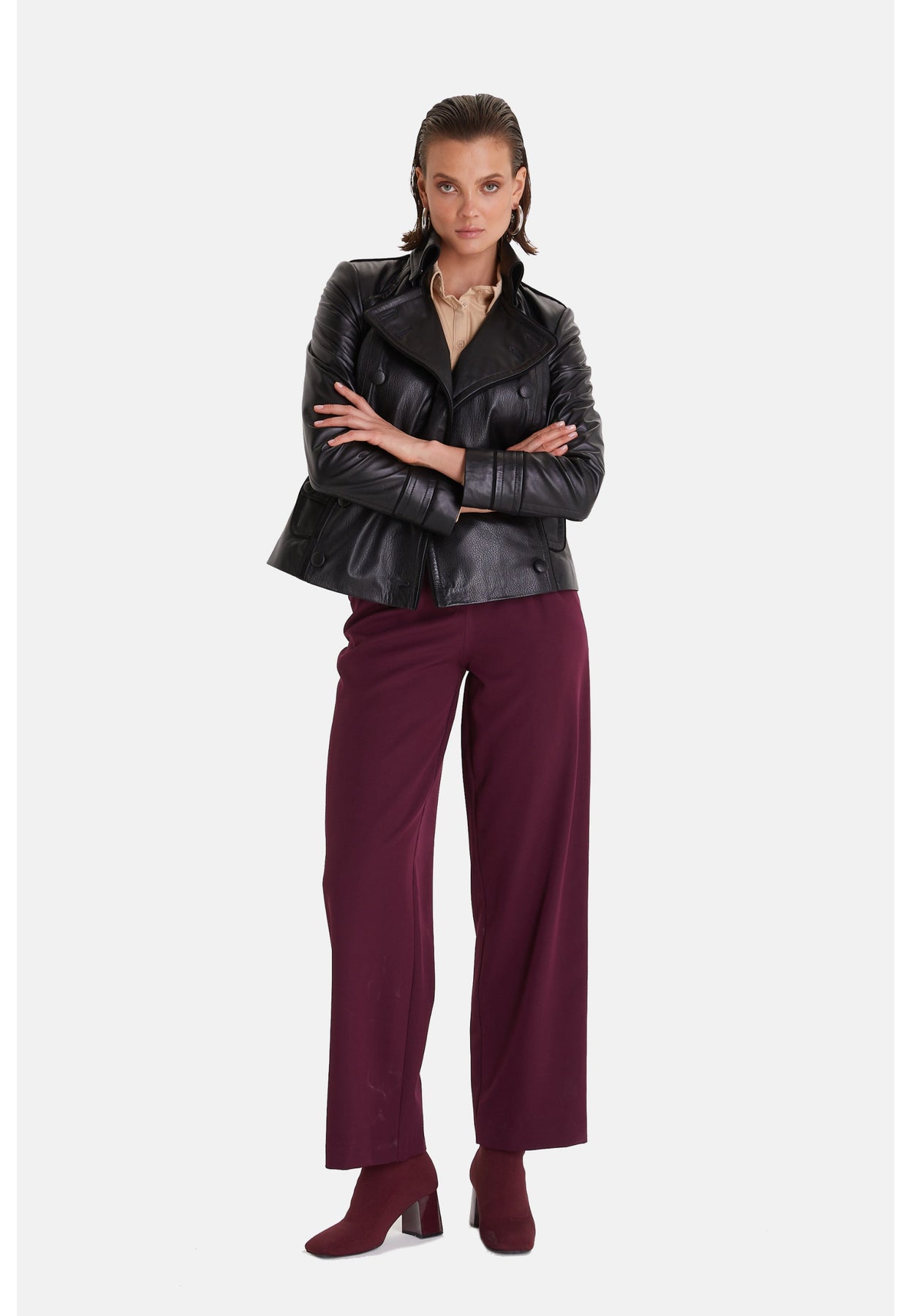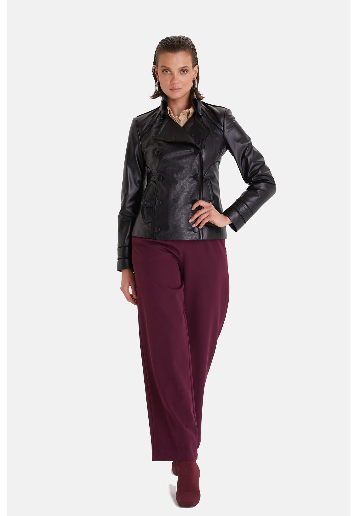 Skillfully crafted from genuine leather, this black women's leather jacket features a unique cracked aging finish that adds a touch of vintage elegance. The double-breasted design gracefully folds across the body and gently pinches at the waist, making it a standout piece. Eye-catching button details further enhance its sophisticated appeal, making it an ideal choice to complement your stylish dresses.
