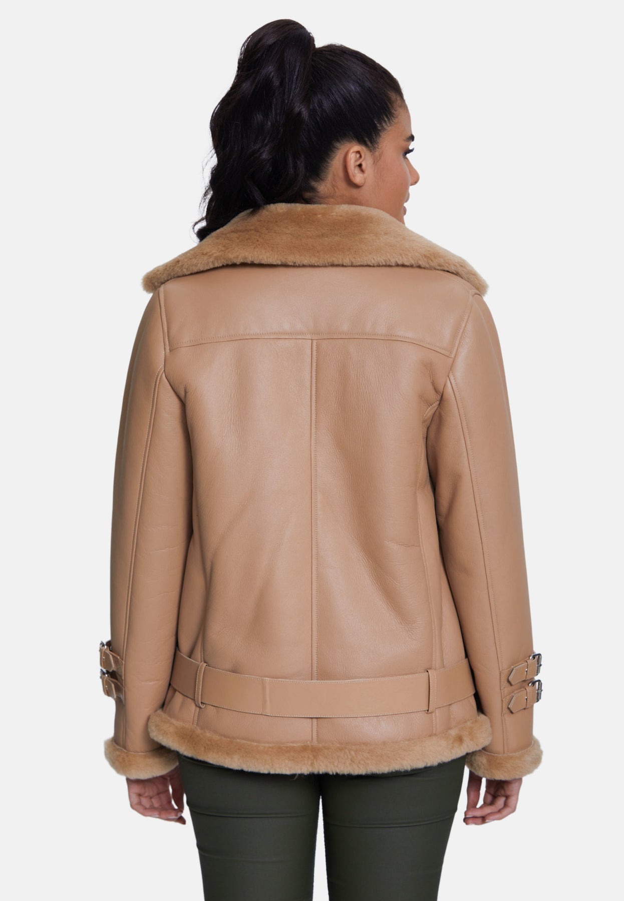 A ultimate luxurious biker design sheepskin jacket for women's asymmetric zip closure and belt for fitting adjustment. Made from sumptuously soft 100% British sheepskin to keep you cozy and warm. The jacket is the perfect piece to provide the insulation you need, whilst the wool trim and buckle fastenings create an elevated style.