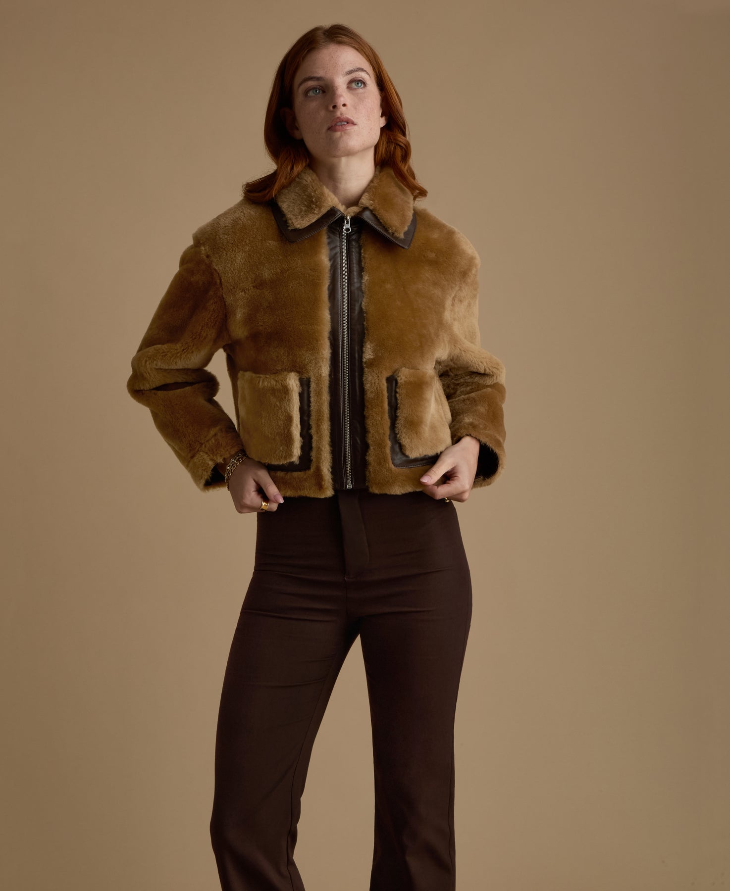 Our Lila Shearling Jacket in brown is cut in a boxy silhouette featuring a sturdy front zip, wide collar and practical front patch pockets. A modern take on classic shearling outerwear, designed to elevate everyday winter dressing with ease. The plush shearling in contrast with nappa leather detailing makes for a statement winter look.
