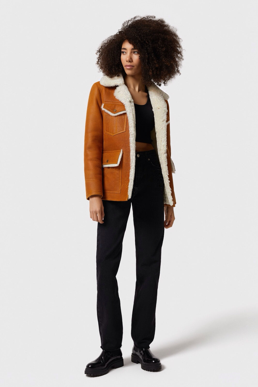 Our elevated take on the trucker jacket trend the coat is crafted from premium quality British double face sheepskin for all-over softness and warmth. Featuring exposed shearling on the collar and pocket, plus chest pockets, side pockets, and center snap closures for easy on-off, this thoughtfully-crafted jacket is an ultra-versatile outerwear piece that's perfect for layering over tees, sweaters.
