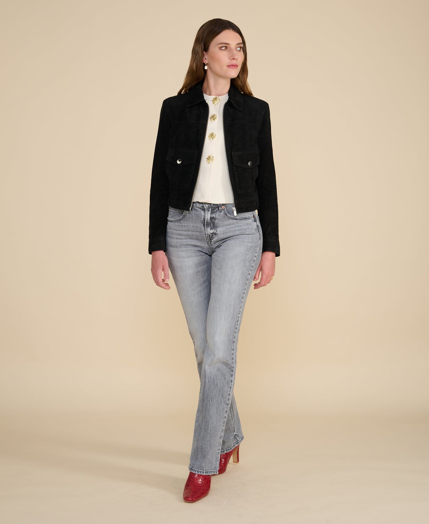 Step into spring with elevated style. Our Isabella black suede jacket, blends timeless elegance with modern edge. Featuring front pockets, refined cuff detailing and a soft, supple texture making it the perfect layering piece.