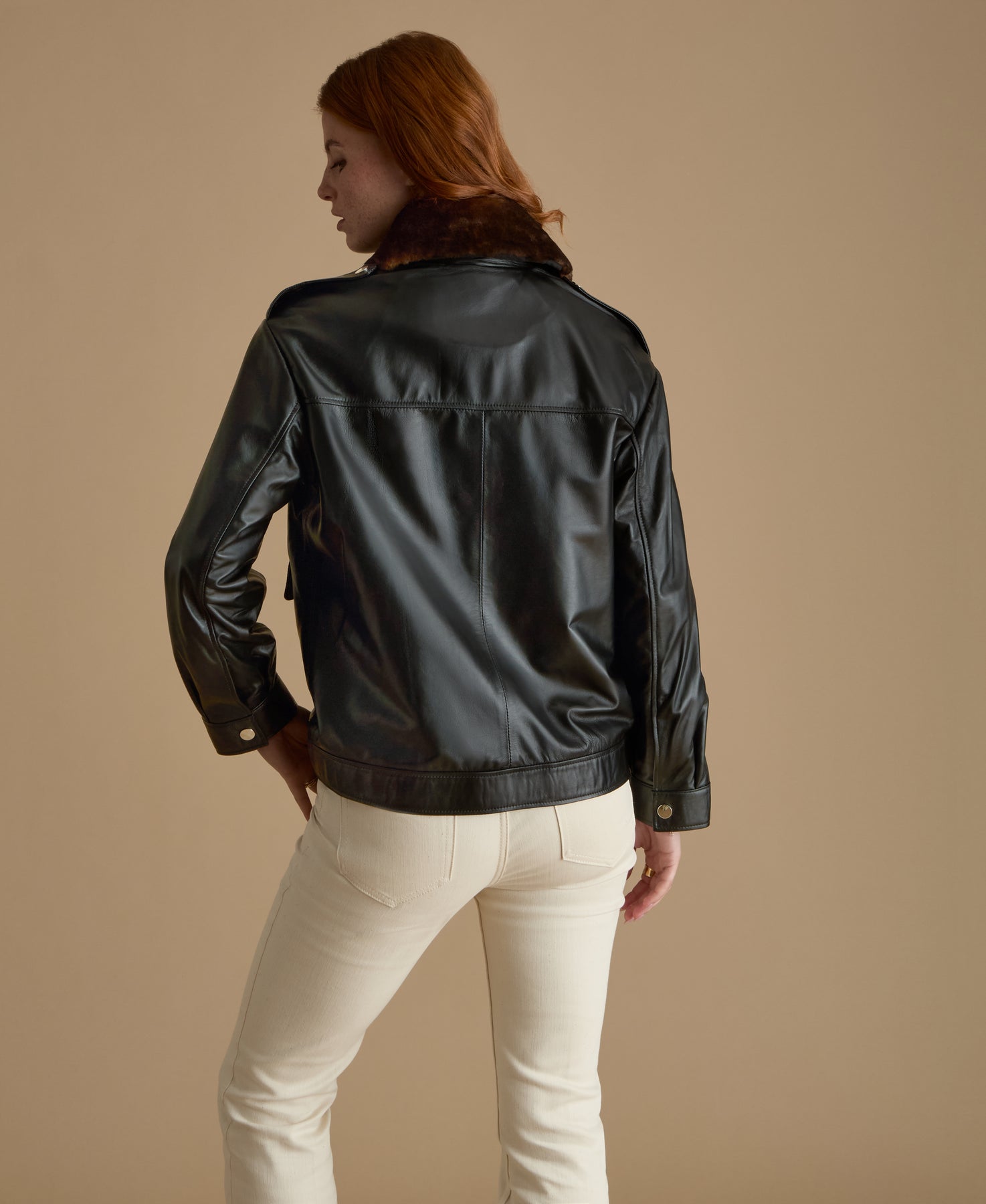 Our Alma Leather Jacket is crafted from premium, supple leather in a classic black tone, this jacket brings together durability and refined style. The detachable shearling collar adds adaptable comfort, wear it with the plush shearling trim for a winter-ready look or remove it for a cleaner and streamlined silhouette.