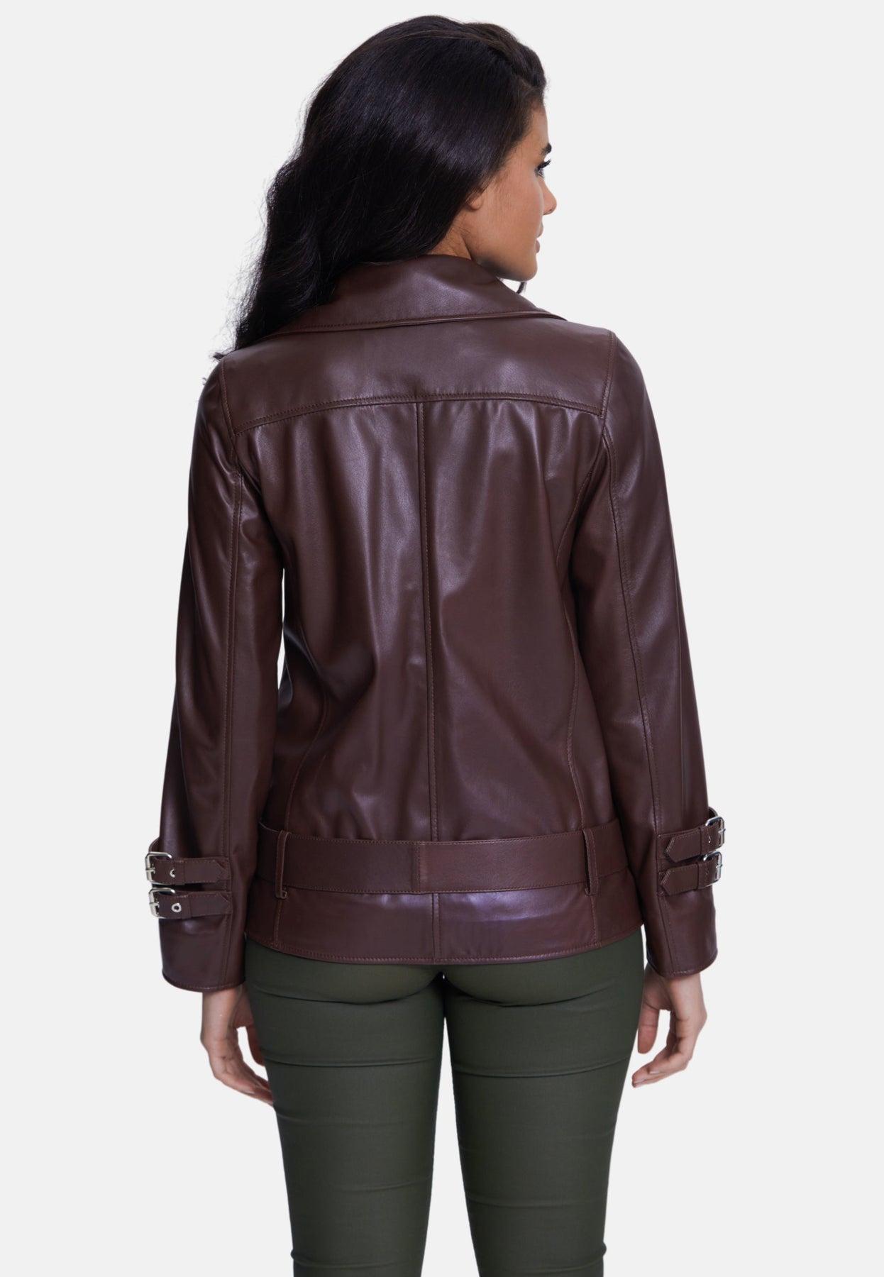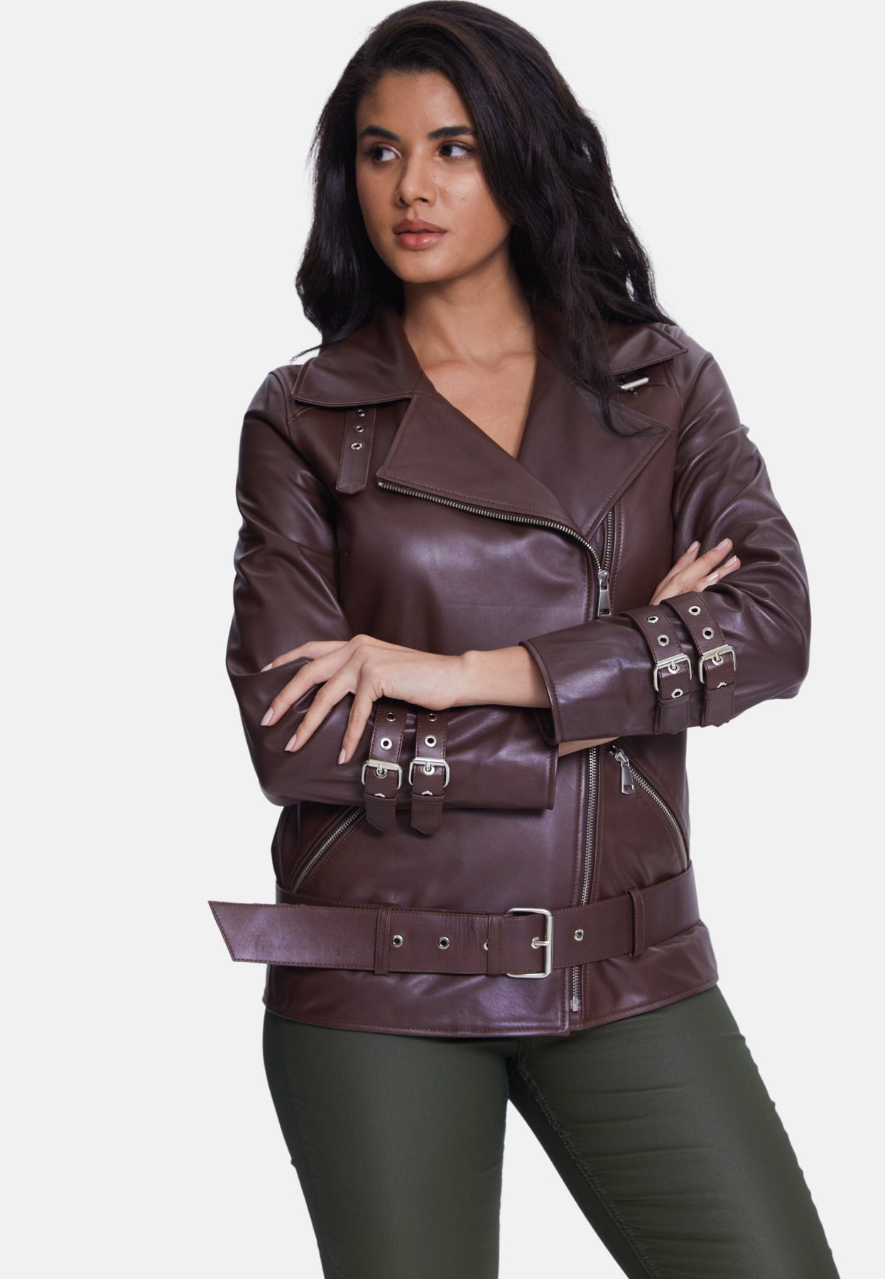 A ultimate luxurious biker design leather jacket for women's asymmetric zip closure and belt for fitting adjustment. Made from sumptuously soft 100% British nappa leather to keep you cozy and warm. The jacket is the perfect piece to provide the insulation you need, whilst the trim and buckle fastenings create an elevated style.