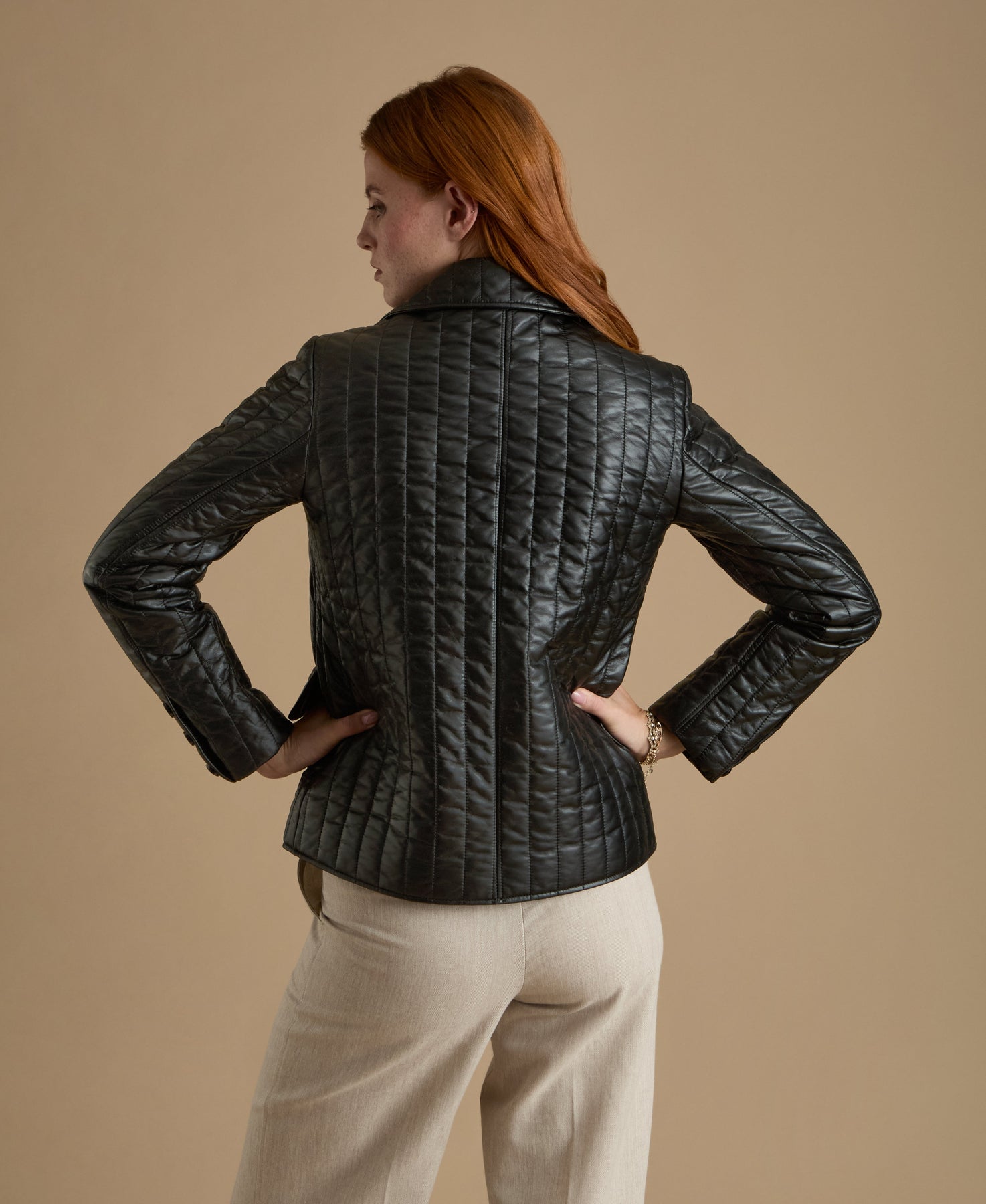Our Tabitha Leather Coat. Indulge in the luxury of 100% British Leather with this exquisitely handcrafted jacket. Designed for both style and comfort, the quilted black outer layer provides an unmatched feel. Elevate your wardrobe with this timeless piece.